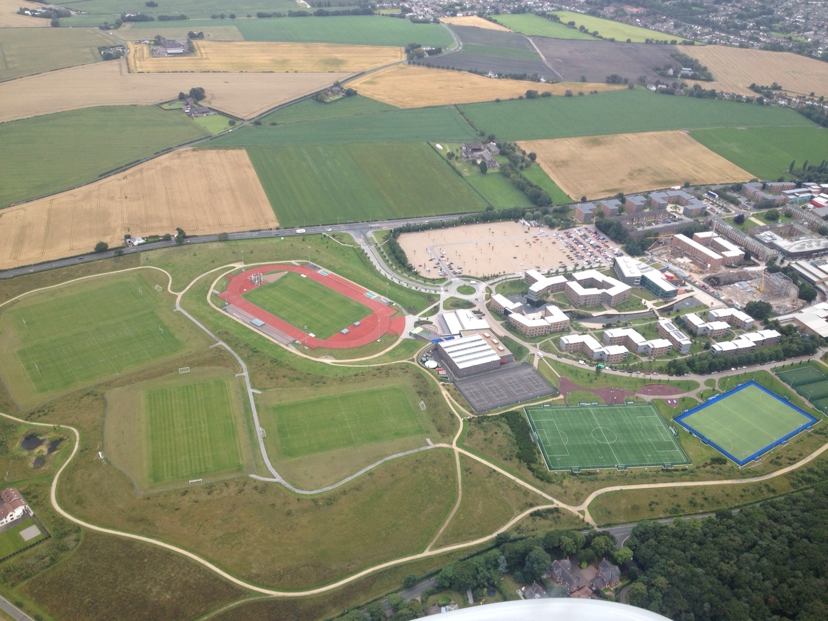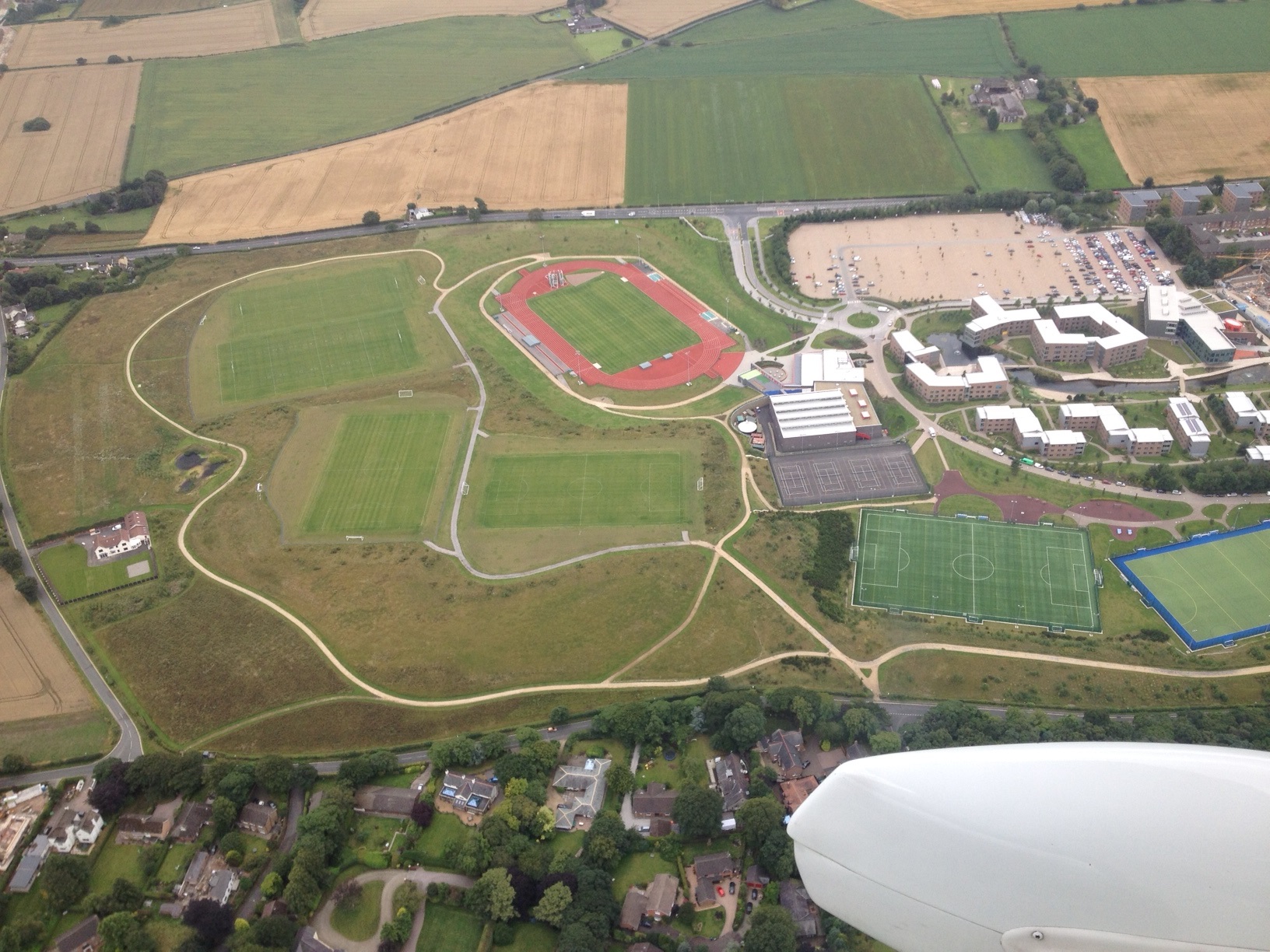 John Dickinson had the good fortune of being a passenger in a light aircraft which flew over Edge Hill University on route to Blackpool airport on the 10th August, he has kindly provided us with a couple of aerial photos which I am sure will be of interest to members as the show not only the track but the trails around the campus.