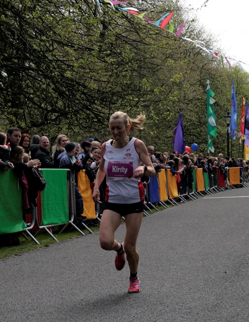 - Kirsty Longley gritting her teeth as she comes home to win the Spring 10k at Sefton Park
