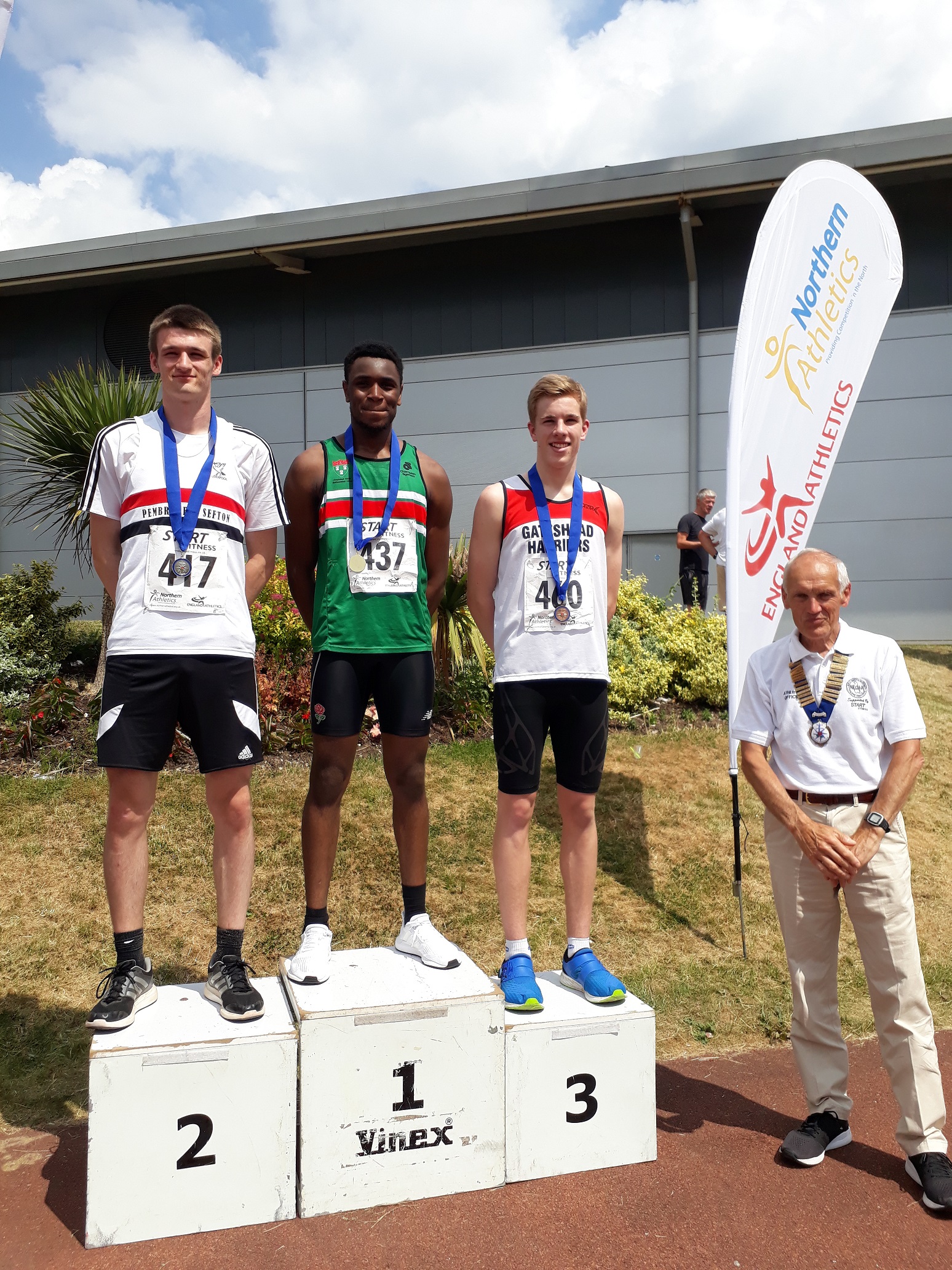 ionship best performance and club record. Also in this age group, Adam Jones took silver in the 2K steeplechase (6:18.0) and Ross Harrison bronze in the 1500m, knocking 7 sec. off his pb in the process (4:08). At Intermediate level, Lauren Lewis was an impressive winner of the 100m (12.4) and Tom Dickinson finished 3rd in a new pb time of 2:03.0. Hope Kennedy took javelin gold with a throw of 28.65m in the junior girl’s event, with Grace Mitchell winning silver in the long jump (4.63m) and Abigael Bamber bronze in the sprint hurdles (12.6). Martha Simms was the club’s sole competitor at the Greater Manchester schools event and although she set a new pb in the long jump (4.85m) it was only good enough for 5th place in a quality competition.